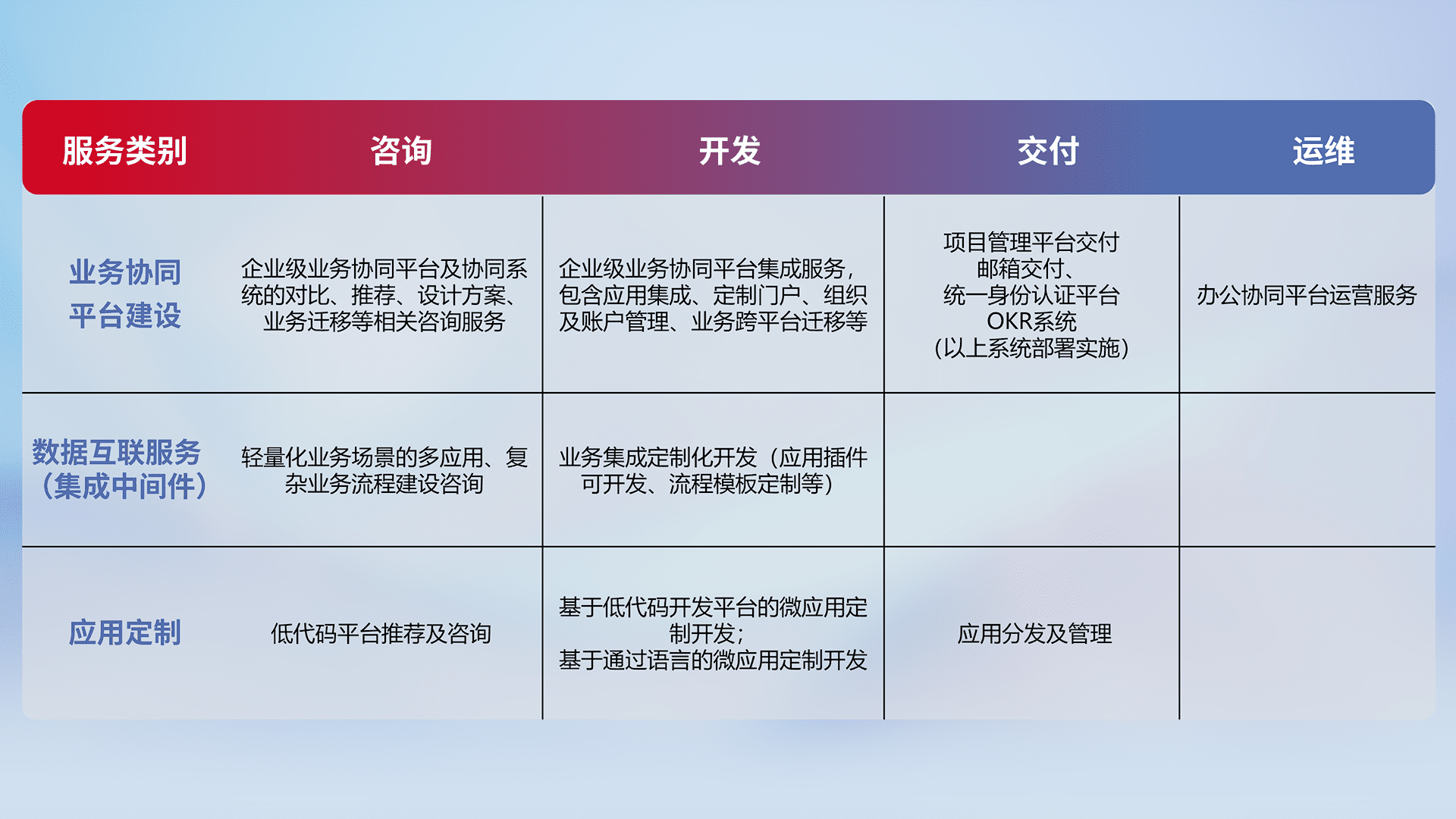 针对钉钉、、、、企微、、、IDaas等平台级产品提供产品的规划、、方案、、交付、、、、定制化开发等服务,,实现如统一协同办公、、、智能客户服务、、混合会议管理、、、、智能数据查询、、、、等业务场景,,,,实现数字化转型。。